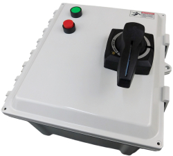 Complete enclosed motor starter control panel with Molded Case Circuit Breaker with integrated disconnnect and door mounted handle.